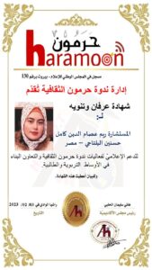 كرّمت ندوة حرمون الثقافية الناشطة الحقوقية دينا جمال بركات – مصر بشهادة عرفان وتقدير، اليوم الخميس، نظير جهودها الإعلامية لفعاليات ندوة حرمون الثقافية ونشر العلم والثقافة والسلام والدفاع عن حقوق الإنسان والوعي المدني.