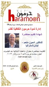 وأصدرت إدارة ندوة حرمون شهادات تكريم للدكتور المحاضر أدمون ملحم وشهادات حضور للمشاركين.