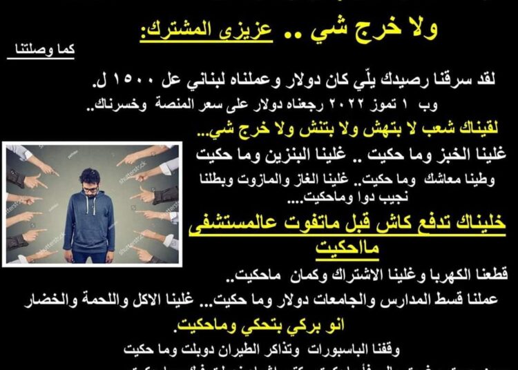 تم تداول منشور على مواقع التواصل يعبر عن واقع الحال، عن ما ارتكب من مسؤولي الدولة بحق المواطن الغائب عن السمع والبصر، عن ما تمت سرقته من جيوب الشعب اللي “لا بتهش ولا بتنش ولا خرج شي”، ولا يمكن بضعة أفراد منه ان يتفقوا على أسمائهم وعناوينهم ولائحة طعام الغداء..