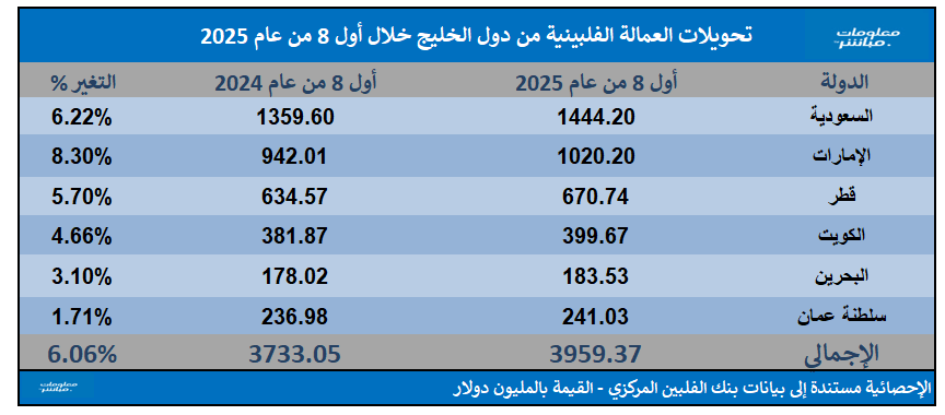 سجلت تحويلات العمالة الفلبينية من دول الخليج الست خلال أول 8 أشهر من العام الحالي 3.96 مليار دولار، مقابل 3.73 مليار دولار بالفترة ذاتها عام 2024.