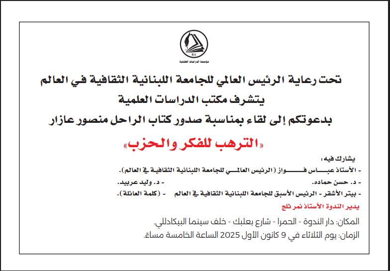 برعاية الرئيس العالمي للجامعة اللبنانية الثقافية في العالم، دعا مكتب الدراسات العلمية إلى لقاء لمناسبة صدور كتاب الراحل منصور عازار، بعنوان “الترهّب للفكر والحزب”.
