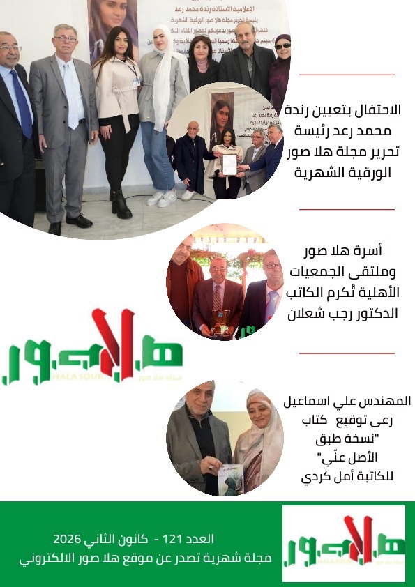 ٠صدر العدد الجديد من مجلة هلا صور الثقافية الورقية الشهرية الرقم 121 كاتون الثاني 2026 التي تصدر عن جمعية هلا صور الثقافية الاجتماعية وناشر المجلة الكاتب الدكتور عماد سعيد ٠