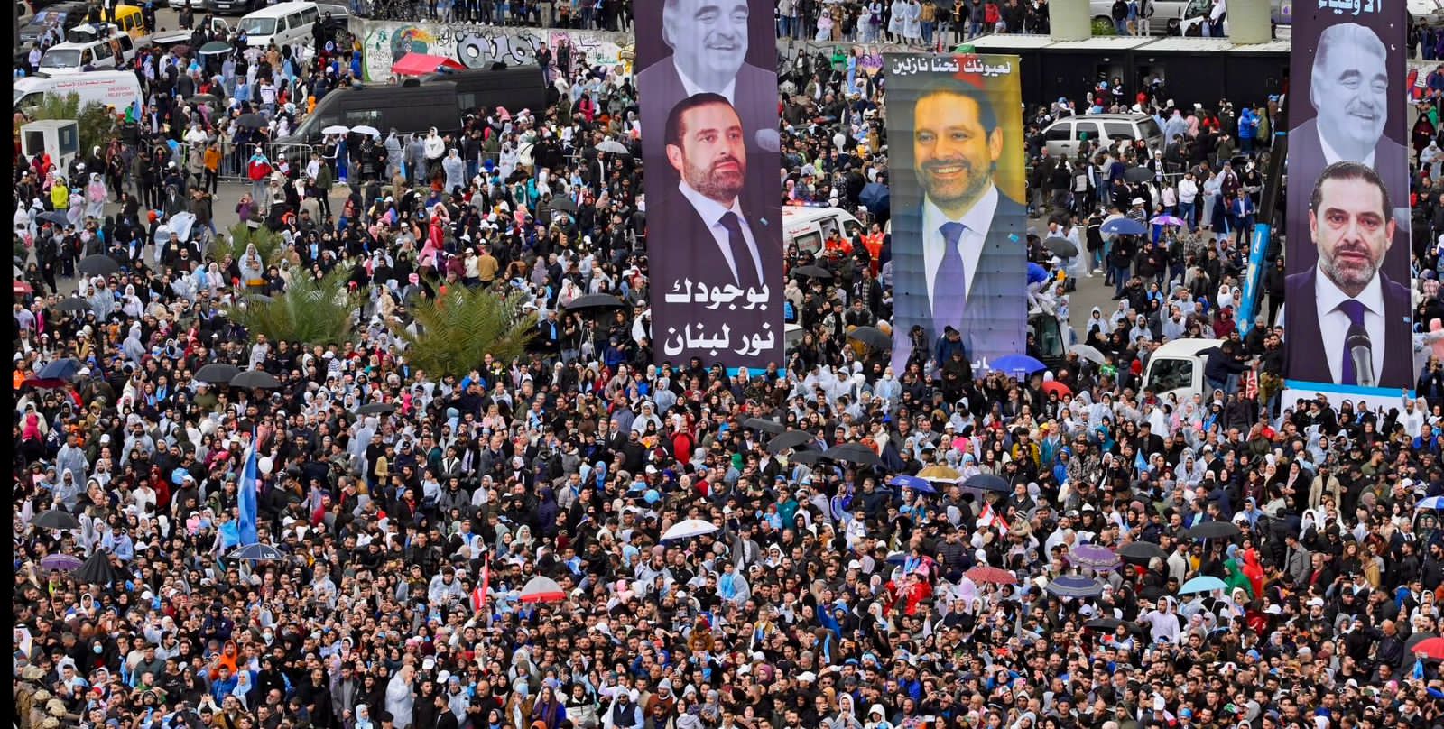المحتشدون رفعوا الأعلام اللبنانية ورايات «المستقبل» وصور الرئيسين رفيق وسعد الحريري وسط إطلاق مكبرات الصوت للأغاني والأناشيد الحماسية.