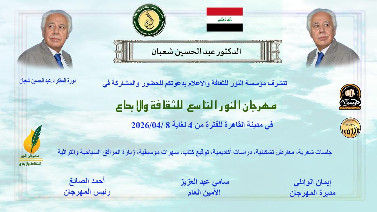 دعت مؤسسة النور للثقافة والإعلام للحضور والمشاركة في “دورة الدكتور عبدالحسين شعبان” – مهرجان النور التاسع للثقافة والإبداع، في مدينة القاهرة من 4 نيسان/أبريل لغاية 8 نيسان 2026.