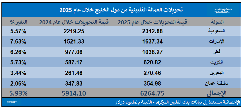 وطبقاً للإحصائية فإن تحويلات العمالة الفلبينية من دول الخليج مجتمعة تُمثل 17.57% من إجمالي تحويلات العمالة الفلبينية من دول العالم في 2025 البالغ قيمتها 35.63 مليار دولار.