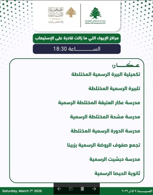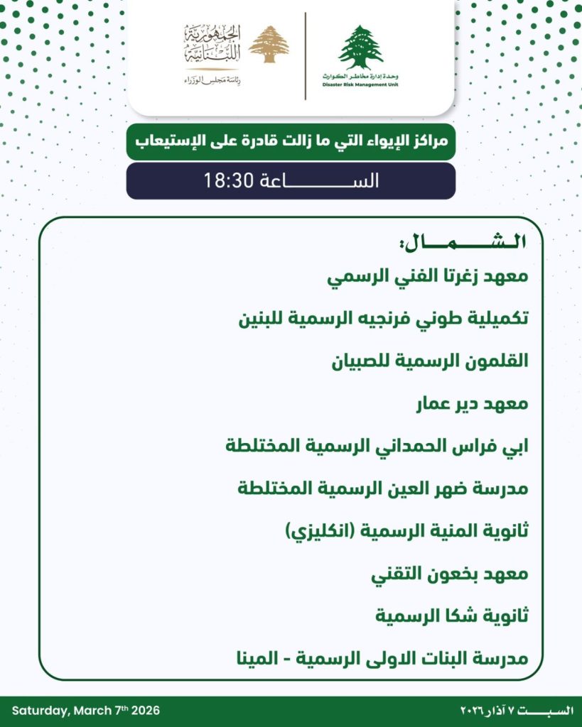 وزعت وحدة إدارة الكوارث عناوين جديدة لمراكز الإيواء. كما أصدرت تقريرها اليومي، الذي أفاد بأن العدد الإجمالي للنازحين في مراكز الإيواء بلغ 112525 والعدد الإجمالي للعائلات النازحة 26163. <img src="https://haramoon.com/wp-content/uploads/2026/03/45-819x1024.jpg" alt="" width="819" height="1024" class="alignnone size-medium wp-image-394781" />