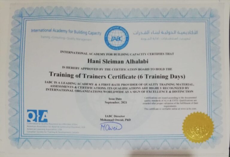 شهادة (TOT) للزميل هاني سليمان الحلبي