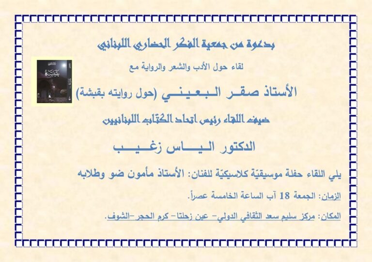 لقاء حول رواية “بقبشة” لصقر البعيني بحضور زغيب