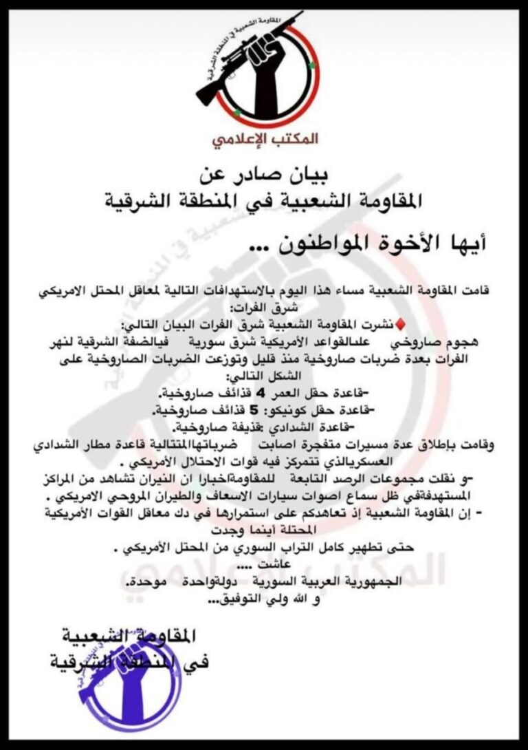 هجوم صاروخي على قواعد الاحتلال الأميركي شرقي الفرات: 10 صواريخ و5 مسيّرات