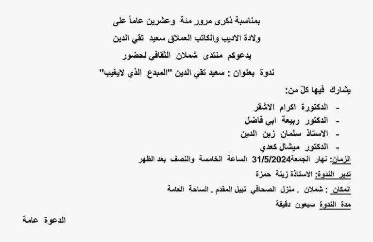 دعا منتدى شملان الثقافي لحضور ندوة حوارية حول موضوع “الاستراتيجية الدفاعية”. يشارك فيها: العميد الركن المتقاعد وليد زيتوني، العميد الركن المتقاعد الدكتور رؤوف الصياح، الباحث الدكتور فيصل مصلح. يدير الندوة الإعلامي عامر ملاعب. وذلك الخميس 17 آب 2023، السادسة مساء.…