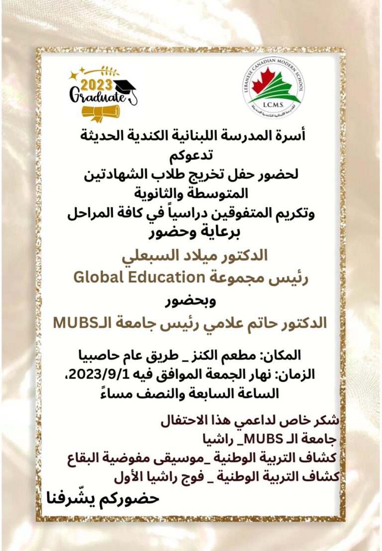 برعاية وحضور الدكتور ميلاد السبعلي رئيس مجموعة Global Eduction وبحضور الدكتور حاتم علامي رئيس جامعة الـ Mubs دعت أسرة المدرسة اللبنانية الكندية الحديثة لحضور حفل تخريج طلاب الشهادتين المتوسطة والثانوية وتكريم المتفوقين دراسياً في كافة المراحل وذلك في مطعم…